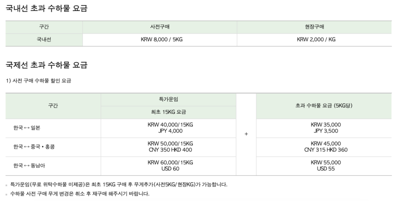 추가 요금: 20,000원 + 무료수화물 허용량 초과시 초과 요금 징수